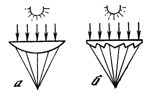 Солнечный свет можно концентрировать, используя эффекты преломления и отражения. Преломление происходит в линзах, а отражение — в зеркалах. Линзы могут быть плосковыпуклые и двояковыпуклые. В последнее время широко используются плоские линзы Френеля (рис. 5.9). Поверхность линз бывает сферической и несферической. Несколько практических схем для собирания света при отражении показано на рис. 5.10.