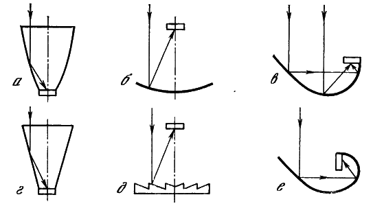 а — параболическое зеркало, отражающее свет к оси в прямом направлении; б — в противоположном направлении; в, с — зеркала в форме профиля морской волны; г — плоские зеркала, расположенные под углом друг к другу; д — параболические зеркала Френеля