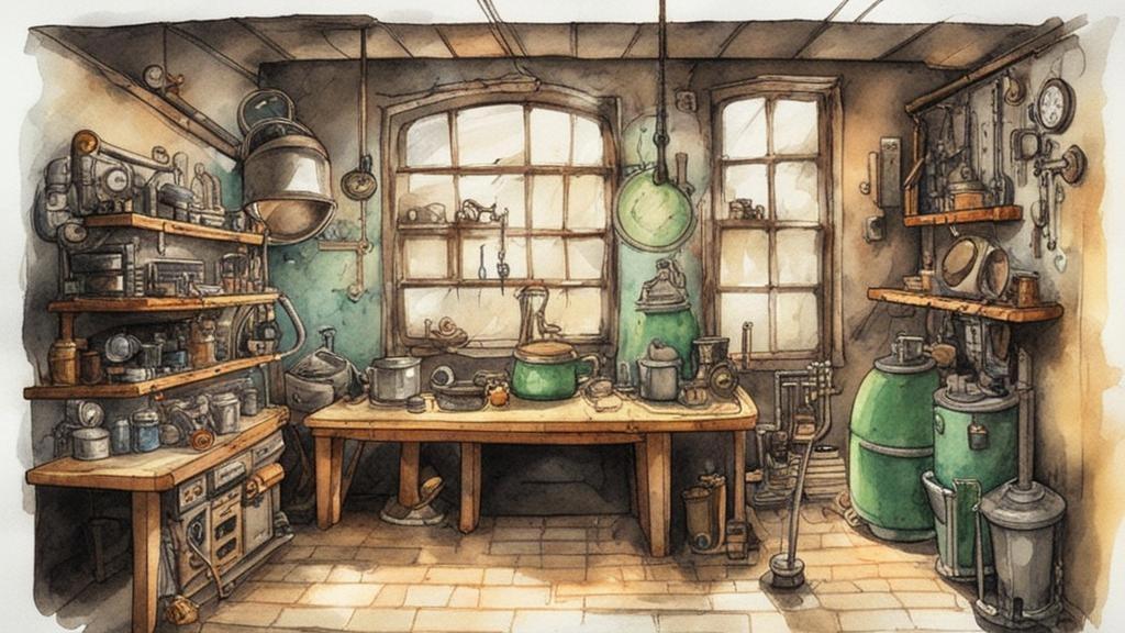 Мы находились в захламлённой комнате. Прямо передо мной стоял большой агрегат из зелёного металла, в углу гудел пламенем плавильный горн. Вся комната была завалена слесарными инструментами, металлическими деталями и чертежами.