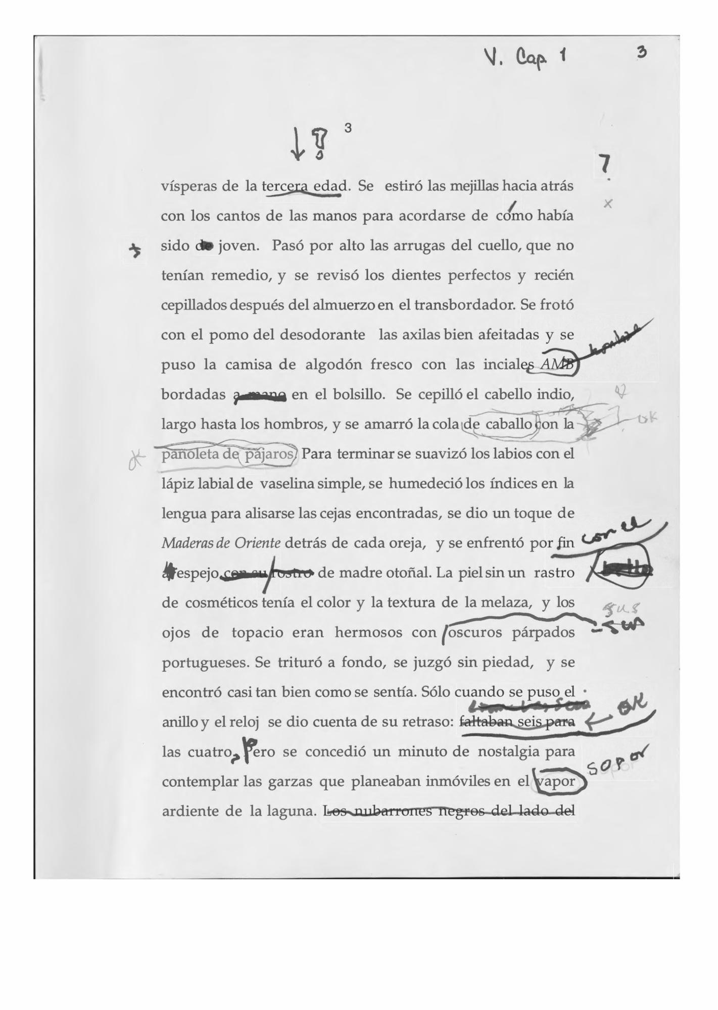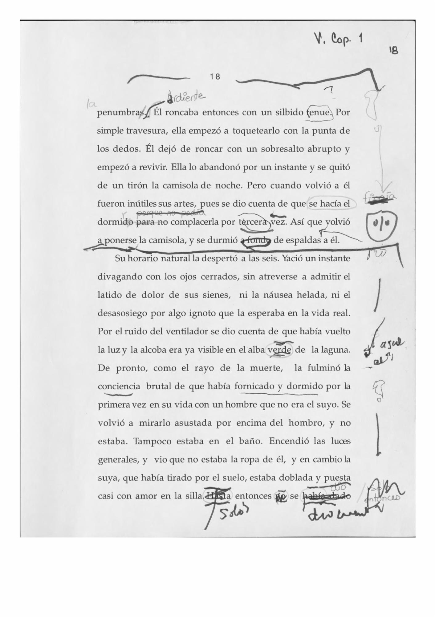 Отношения между автором и редактором — договор о доверии и уважении. Мне посчастливилось работать с Габриэлем Гарсиа Маркесом, и это было непрерывное упражнение в смирении, причем я исходил из того, что он сам сказал, когда Кармен Бальсельс передала мне трубку при нашей первой беседе: «Я хочу, чтобы ты критиковал меня как можно больше, потому что, поставив последнюю точку, к книге я больше не вернусь». В отношении настоящего издания я действовал как реставратор перед холстом великого мастера. Исходя из цифрового документа, сохраненного Моникой Алонсо, и противопоставляя его пятой версии, которую автор считал окончательной, я рассмотрел каждую его рукописную или продиктованную Монике пометку, каждое измененное или убранное слово, иногда фразу, каждый альтернативный вариант на полях, чтобы решить, включать их в текст для публикации или нет. Работа редактора, по моему глубокому убеждению, состоит не в том, чтобы изменить текст, а в том, чтобы сделать текст сильнее уже имеющимися на странице средствами. Это включает проверку и исправление фактических данных, от имен упоминаемых музыкантов или писателей до соответствия возраста героини хронологии повествования.