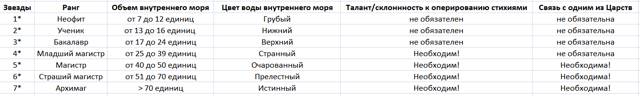 Цвет воды внутреннего моря определяет ее плотность (качество). Одна единица энергии цвета воды — нижний, равна двум единицам — грубой. Отсюда и разница в силах между рангами магов при кажущемся небольшом числовом различии резерва. А между бакалавром и неофитом лежит уже целая пропасть.