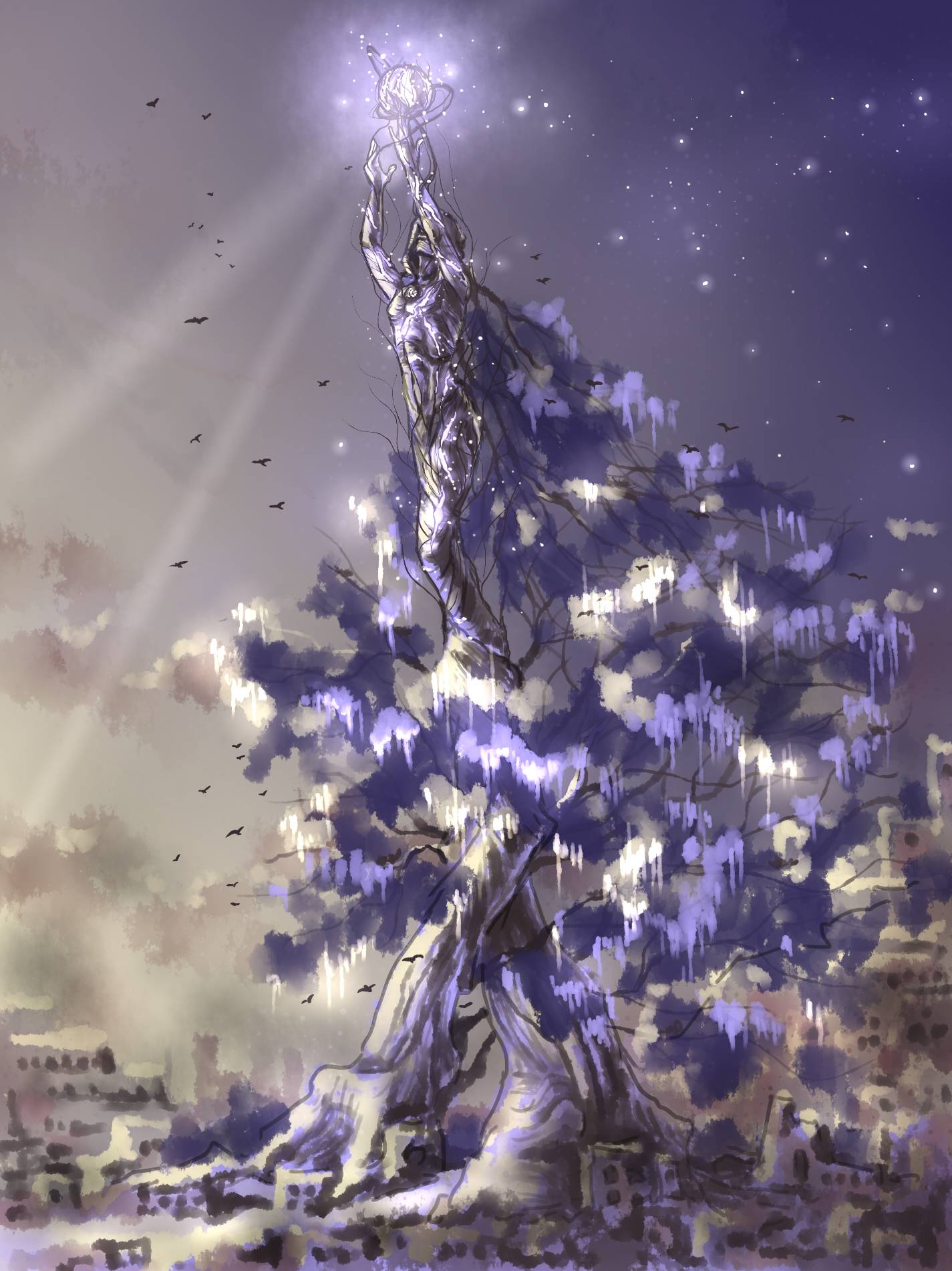 В основании памятника было два ствола дерева. Выше ветви сплетали тело, руки и голову. Между ветвей были ниши, символизирующие раны, полученные им в ходе сражения. Из них водопадом стекала вода к его ногам. Диосмарс стоял, высоко подняв руки, в которых держал планету в миниатюре, внутри неё то и дело вспыхивали «светлячки», напоминая о том, что творилось на этой земле. Тысячи птиц свили гнёзда внутри макета, они кружили вокруг, будто спутники спасённой планеты.