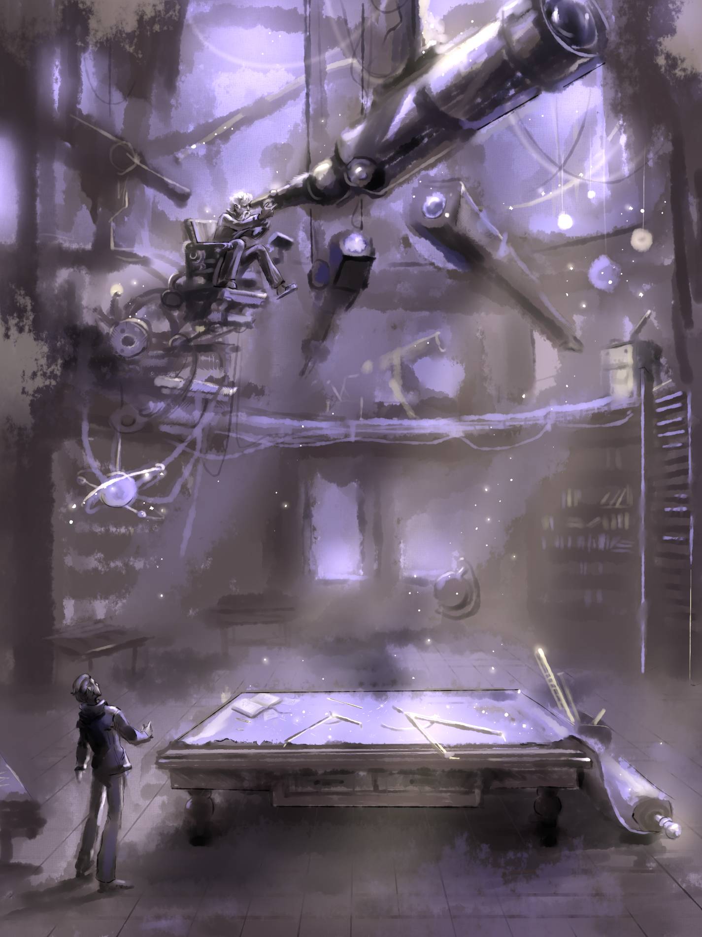 Он осторожно открыл дверь. Ни прихожей, ни коридора. Весь дом состоял из одной комнаты и крошечной уборной. В центре комнаты стоял огромный квадратный стол, занимающий чуть ли не всю площадь. На столе была развёрнута карта звёздного неба и какие-то непонятные чертежи. По периметру комнаты также стояли столы, но узкие, служащие в качестве места хранения различных приборов.
