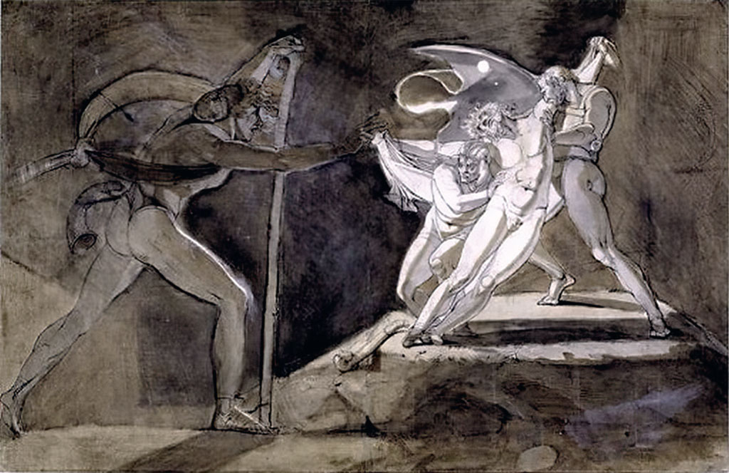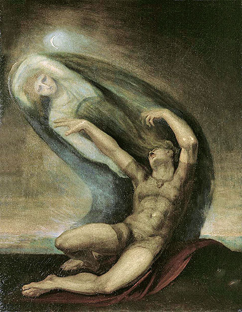 Необычное видение Фюссли замечательно иллюстрирует картина «Ахиллес и дух Патрокла». События «Илиады» рассказывают нам о близких, возможно, даже романтических отношениях великого воина Ахиллеса и его друга Патрокла. Ахиллес отказывается выйти на сражение под Троей. Патрокл надевает доспехи Ахиллеса и вдохновляет войско греков участием в боях, но гибнет от руки троянского воина Гектора. На картине изображен эпизод поэмы, в котором дух Патрокла навещает Ахиллеса во сне и просит устроить ему достойные похороны, а после смерти самого Ахиллеса – смешать их кости в одной вазе. Античный сюжет замечательно подходит для классической живописи, но трактовка Фюссли для классицизма немыслима. И все же нетипичный, маньеристский изгиб тела Ахиллеса и сверхъестественная дуга, по которой движется дух Патрокла, прекрасно передают образ фантастического видения.