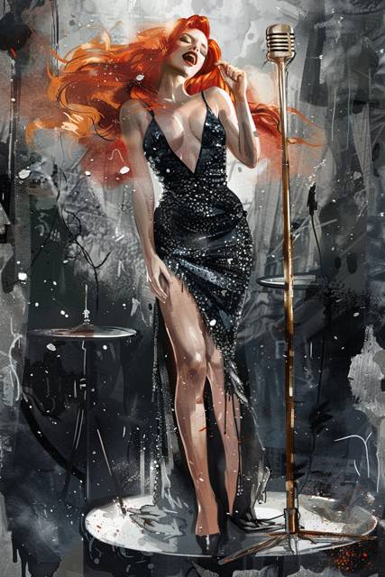 С аккуратной талией; небольшой, высокой грудью, едва прикрытой декольте платья, добиравшегося до живота; её красные губы слегка приоткрылись и, взмахнув рукой, она разметала копну до того рыжих, что почти огненных волос. Густых, как рожь на поле; вьющихся и длинных — ниже спины.