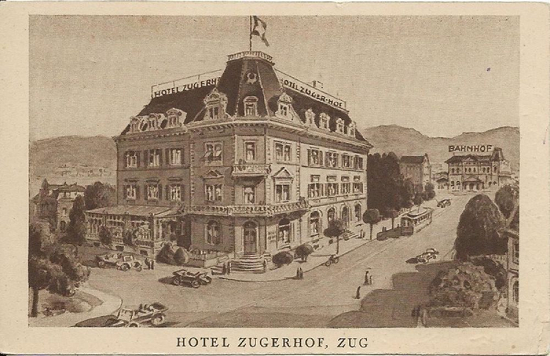 Гостиница "Цугерхоф". Справа — здание железнодорожного вокзала (Bahnhof).