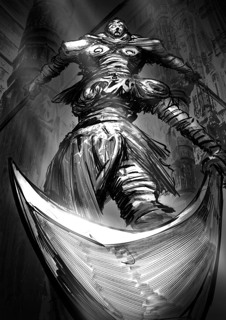 Девушка подпрыгнула. Гудящим маятником лезвие сдуло всю пыль, что скопилась на черных плитах храма. Гон сиганула на руку великана. Прыжком уклонилась от копья, которым голем хотел смести ее с плеча. Добралась до шеи и клином на секире попыталась сколоть кадык великана. — «Железный!»