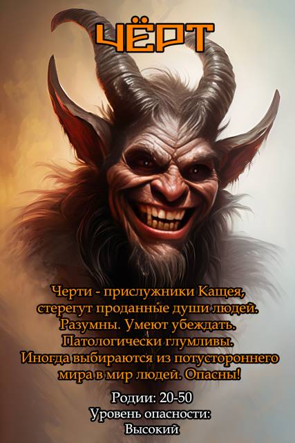Я припомнил всё, что было написано в справочнике про чёрта. Не так уж много. Внешность описана довольно точно. Силой, против колдуна, обладает в пять раз большей. Уровень опасности — запредельный. Вообще, по жизни, тусуется в потустороннем мире, где стережёт души умерших людей. Но иногда случаются эксцессы, и черти выбираются в наш мир. Где немедленно начинают куролесить.