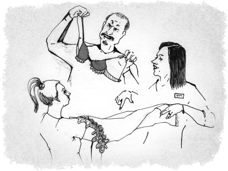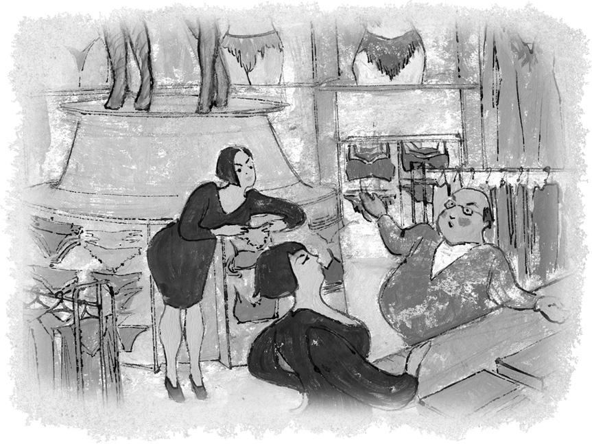 – Вам, мужчина, трусики или бюстгальтеры? Может, пеньюарчик фирменный? У нас все высшего качества, сплошная заграница! Выбирайте.