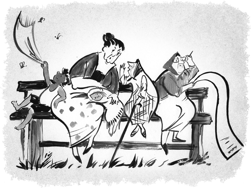 Особое внимание уделялось проходящим мимо жителям, их обновкам в одежде, состоянию трезвости и на каком расстоянии находились женщины от своих спутников, тем более если они не были связаны друг с другом брачными узами. От этих бдительных смотрящих во многом зависела дальнейшая жизнь сельчан – останутся ли они в когорте добропорядочных и благопристойных или перейдут в группу аморальных и ветреных. Назавтра результаты увиденного непременно отразятся в новостях у колодца, а далее разнесутся вместе с вёдрами по домам, где будут поданы в качестве утреннего десерта и обсосаны как петушки на палочке.