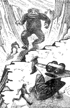 Рон сделал ещё один спотыкающийся шаг, потом упал на склон. Он, тяжело дыша, лежал на горячих камнях, все ещё крепко сжимая в руке блестящий молот, и лёгкие его наполнялись свежим воздухом. Облегчение и усталость нахлынули на него. Ему хотелось здесь и уснуть. Но он достаточно хорошо знал, что с исчезновением лягушко-медведя опасность ещё далеко не устранена. Они все ещё находились в центре скалистой местности. Где-то поблизости были шпрингеры, которые не потерпят, чтобы трое землян проникли в их тайны, а потом беспрепятственно вернулись бы в город и сообщили о том, что они здесь увидели.