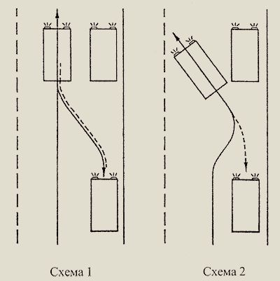 Первый: вы останавливаетесь во втором ряду, как ехали, примерно вровень с тем автомобилем, за которым вы собираетесь запарковаться, или чуток впереди него, но не ближе 25-30 сантиметров от его борта (схема 1). Включаете заднюю передачу и трогаетесь, колеса при этом выворачиваются вправо, но не резко, средне. Как только средняя стойка вашего автомобиля (место, где крепится ремень безопасности) поравнялась с задним бампером этого автомобиля (за которым вы будете стоять), вы начинаете крутить руль в обратную сторону — влево, хоть вам и кажется, что зад вашего автомобиля еще не совсем вошел в свободное пространство, — войдет позже, никуда не денется.