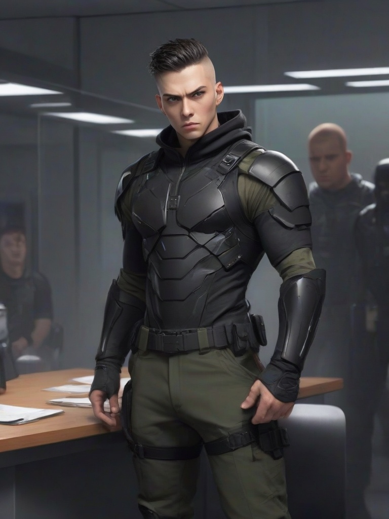 И оружие – первое, на что я обратил внимание. Дальше я бегло пробежался по его внешности. Весьма молодой. Но это только с виду. Обычно такие, как он, переносят множество операций, причём по несколько раз за год, чтобы по внешности невозможно было пробить человека. Даже сейчас поиск по внешности в базах данных выдал ошибку. У него были полностью выбриты виски, на макушке почти вертикально вверх росли достаточно длинные волосы. В правом ухе была гарнитура, которая была в прямом смысле слова вживлена в это самое ухо. Свирепый взгляд. Густые брови. Достаточно мощный нос, но не сильно выступающий. Не картошка, но и не «игла», что-то среднее. Впалые щёки, немного «сухие» губы, широкий подбородок и несколько узкая челюсть. Он меня буквально прожигал взглядом. А это плохой знак.
