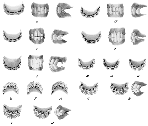 Зубы лошади: а – годовалой; б – 2-летней; в – 3-летней; г – 4-летней; д – 5-летней; е – 6-летней (нижняя челюсть); ж – 7-летней (нижняя челюсть); з – 8-летней (нижняя челюсть); и – 9-летней (верхняя челюсть); к – 10-летней (верхняя челюсть); л – 11-летней (верхняя челюсть); м – 12-летней (нижняя челюсть); н – 15-летней; о – 18-летней; п – зубы лошади старше 20 лет.