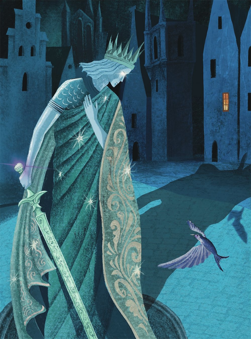 Целый день она летела и только к ночи стала думать о ночлеге. В это время она пролетала над городом, посредине которого высилась статуя Счастливого Принца. Ласточка заметила ее и тотчас же опустилась к подножию Счастливого Принца.