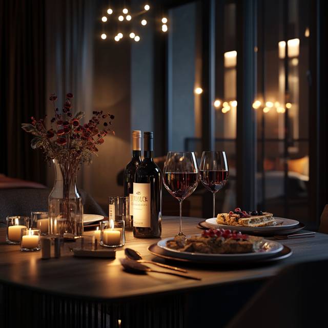 [Войдя, она с удивлением осмотрела романтическую обстановку. Особенно ее поразил богато накрытый стол — она явно не ожидала таких кулинарных талантов.]