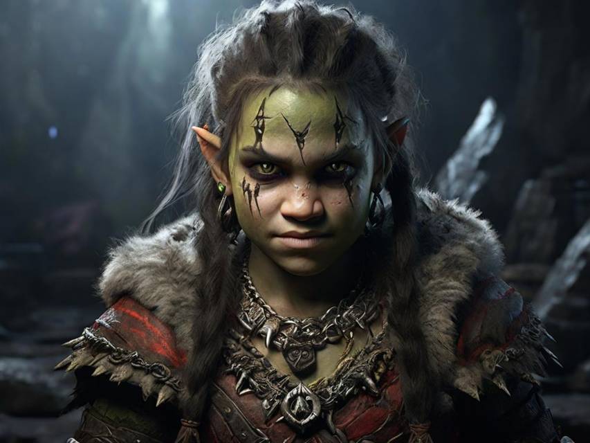 И вот из сгустившейся темноты поднялась наверх по лестнице и встала на пару ступеней ниже меня бойкая девчонка лет… тринадцати? Кожа с сильным зелёным отливом, острые прижатые уши, зубки-клыки видны из-под губ при каждой ухмылке или слове, жёсткие волосы, заплетённые рядами, и мех с железными набойками нашиты на плотный кожаный доспех. Лицо девочки «украшали» нарисованные чёрной сажей порезы и шрамы. Однако.