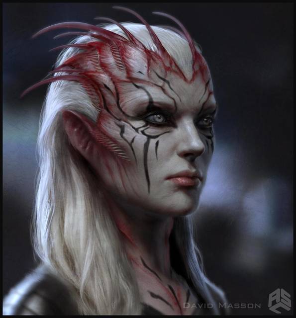 Вместо вездесущего шестирукого покрытого мехом торговца за стойкой скучает женщина-пришелец[1]. Её кожа носит тускло-серый оттенок, отливающий багрянцем возле ушей, висков и линии волос. Если их вообще можно так назвать. Извивающиеся, словно живые, серебристые нити постоянно шевелятся. От кожного покрова к макушке уходят изгибающиеся не то перья, не то отростки плоти. Глаза серебристые в окружении чёрных племенных татуировок. Всё вместе — странное, завораживающее зрелище.