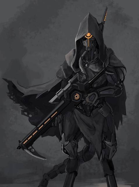 Пол следующего понять невозможно. Гуманоид[3], затянутый в глухой доспех с ног до головы и такой же шлем, за плечами плащ, а голова укрыта капюшоном. Строение нижних конечностей — пальцеходящее, как у собаки, с выгнутой в обратную сторону пяткой. Бронированный хвост свисает через специальное отверстие в кресле. У подлокотника примостилась снайперская винтовка, размерами не уступающая солидной ракетнице. Данайл «Копьё-во-Мгле» Фериос.