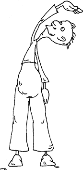 Затем исходное положение фиксируем и растягиваем левый бок: левая ладонь на затылке, взгляд направлен вниз и в сторону, корпус наклоняем вправо. После этого, не меняя наклона, вес тела переносим на левую ногу и еще больше растягиваем левый бок.
