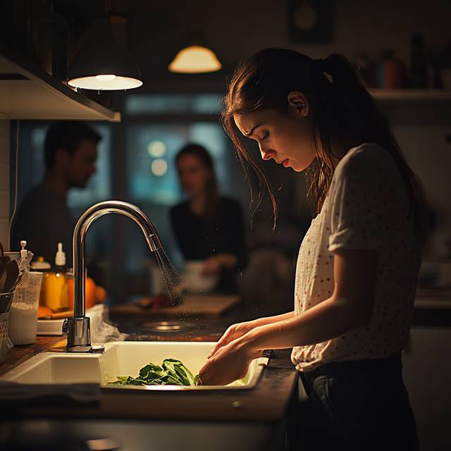 На кухне Рина неумело взялась за мытье овощей. Она даже не подумала закатать рукава, и они тут же намокли. Саня с улыбкой наблюдал за ее стараниями — было очевидно, что она впервые занимается домашними делами.