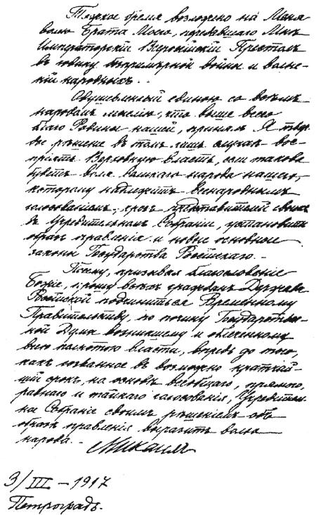 Из дневника Николая II: «3-го марта. Пятница… Алексеев пришел с последними известиями от Родзянко. Оказывается, Миша отрекся. Его манифест кончается четыреххвосткой для выборов через 6 месяцев Учредительного Собрания. Бог знает, кто надоумил его подписать такую гадость!..»