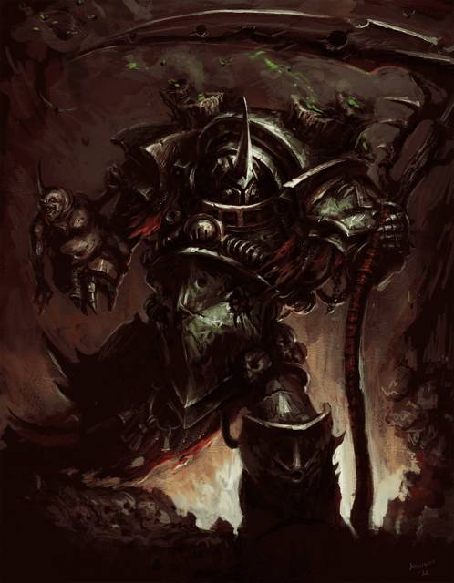 Однако её подозрения превратились в настоящую панику, когда она увидела, кто вышел их арки. Закованный в огромную зелёную броню, из его спины словно исходили костяные трубы. На поясе висели десятки голов, полных личинок, а в руках он держал гигантскую ржавую окровавленную косу. И стоило ему полностью явится, как громогласный глас раздался по всему помещению.