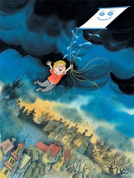 Не долго думая, мальчик схватился обеими руками за хвост Бумажного Змея, оттолкнулся обеими ногами от подоконника и через мгновение уже летел над крышей своего дома, а потом над целым городом и его окраинами, а потом над полями и над лесами, реками и озёрами, и с высоты он смело смотрел вниз, на землю, и у него, честное слово, совсем не кружилась голова…