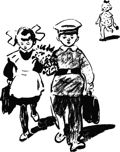 Марина Львовна тоже подошла и пожелала детям счастливого пути. Взяв цветы, Женя и Света побежали в школу. Женя уже не оглядывался: он довёл сестру до детского сада и думал, что она там готовится к утренней гимнастике.