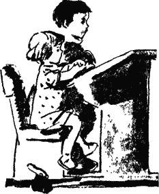 Так Саня добилась, чего хотела: она учится в школе вместе с Женей. Она сидит на скамейке, над столиком едва видна её голова: столики ведь делали не для дошколят!