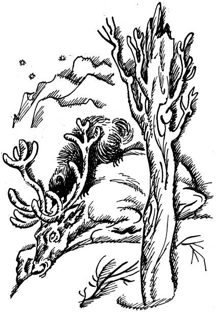 Звёзды снова сияли в небе, когда Каркаджу, исполненный желания мстить и разрушать, устремился вниз по каньону. Он переел и чувствовал тяжесть в желудке, так что двигался медленно. По пути он осматривал заячьи норы, которые вели к лабиринтам под снегом, покрывавшим густые заросли кустарника. Если ему случалось наткнуться на зайца, хищник довольствовался тем, что пугал трусишку. В погоню он не пускался.