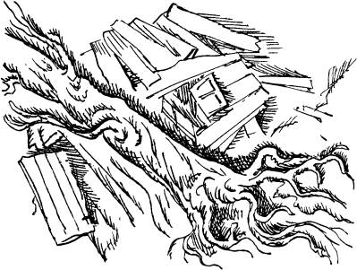 Чуть повыше хижины повалился последний ряд ёлок. Деревья ломались с треском и стонами. Цела осталась только небольшая группа их справа от хижины, там, где лавина обогнула выдававшийся край скалы. Грязный, бурлящий поток, как страшный сон, ринулся на просеку.