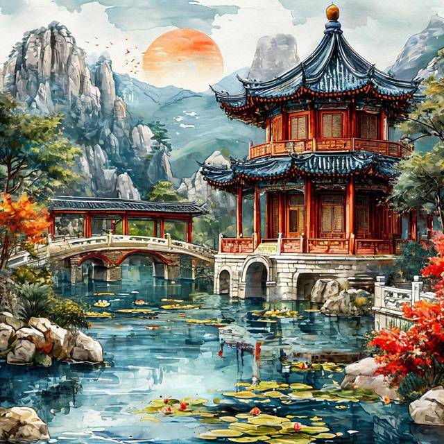 Оформление у всего этого — залюбуешься. Закатное солнце над горами, водоем с лотосами, острые кончики крыш. И горький детский плач.