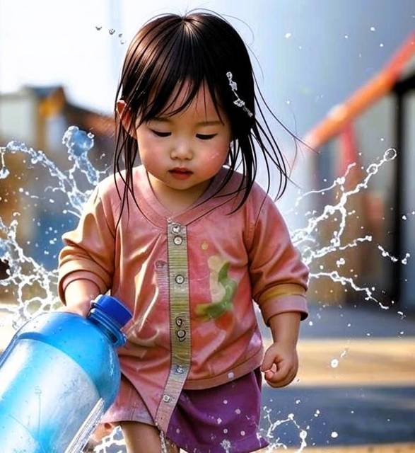 Воду девушка разольет возле зеркальной стены, это мы сопрем. Так что сначала личико малышки (моё) героиня увидит в луже, затем, подняв глаза, увидит омолодившееся «отражение» целиком. Потычет пальцем в стекло. Отражение тыкнет в ответ. Обе корчат рожицы, машут руками. А затем мелкая превращает набор случайных жестов в танец.