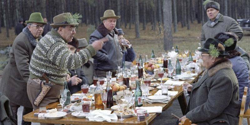 На месте нас ждет банька, где егеря отводят душу, хлеща во всю мочь тушки лидера кубинских революционеров и главы советских коммунистов. Затем мы пьем много чая и садимся обедать чем бог послал. А послал он супчик из тетеревов, жаркое из дичи и большие пироги с ягодами. Фидель в пище неприхотлив. В свою прошлую поездку по СССР ел борщ и сало со свинаркой Марией в украинском селе, пил с геологами водку из бутылки. Фидель отдавал должное русским блюдам — солянкам, борщам, котлетам, пирогам. И особенно ему понравился цыпленок Тапака.