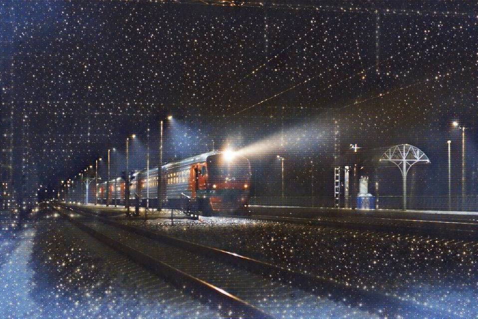 Поезд мчится сквозь ночь. Мимо пролетают чёрные деревья, дома, столбы, редкие машины.