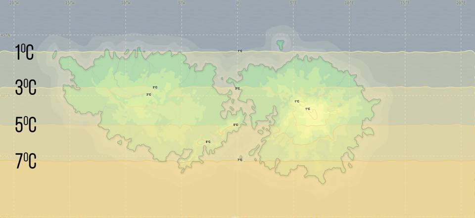 Средняя годовая температура в зависимости от высоты и координат колеблется от одного до семи градусов по Цельсию. Даже в самой высокой и северной точке нет вечно снежных областей. Объем годовых колебаний температур в среднем около тридцати и сорока четырех градусов по Цельсию в зависимости от координат места. А это значит максимальную среднюю годовую температуру летом в южных областях в двадцать четыре градуса и минимальную среднюю годовую температуру зимой в северных областях и на вершине горы Ромула в минус двадцать один градус.