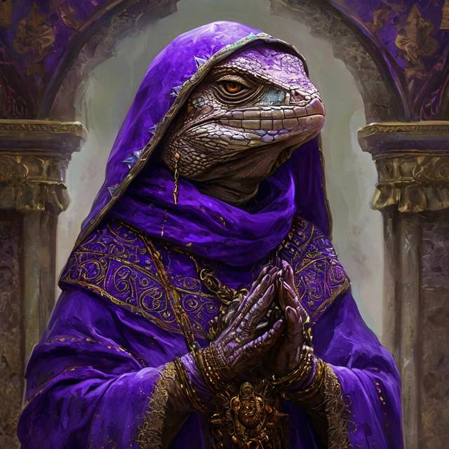 Правила же ими всеми верховная жрица храма воды, что редко покидала свой храм-зиккурат. Что примечательно уже пожившая женщина имела частично пурпурные чешуйки, да и сама постоянно облачалась в фиолетовые церемониальные одеяния. Этот цвет красителя был крайне сложно выводимым и соответственно невероятно дорогим.