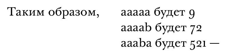 Другие цифры и их комбинации оставим исключительно для алфавита. Затем возьмем из них следующие пять (от 9 до 45) для обозначения гласных. Прочий алфавит следует в обычном порядке с использованием комбинаций вплоть до тройных, сперва — те, где в конце и начале стоят четные, дающие при сложении девятку, а когда они кончатся — остальные, с нечетными в начале и конце, дающие восьмерку.