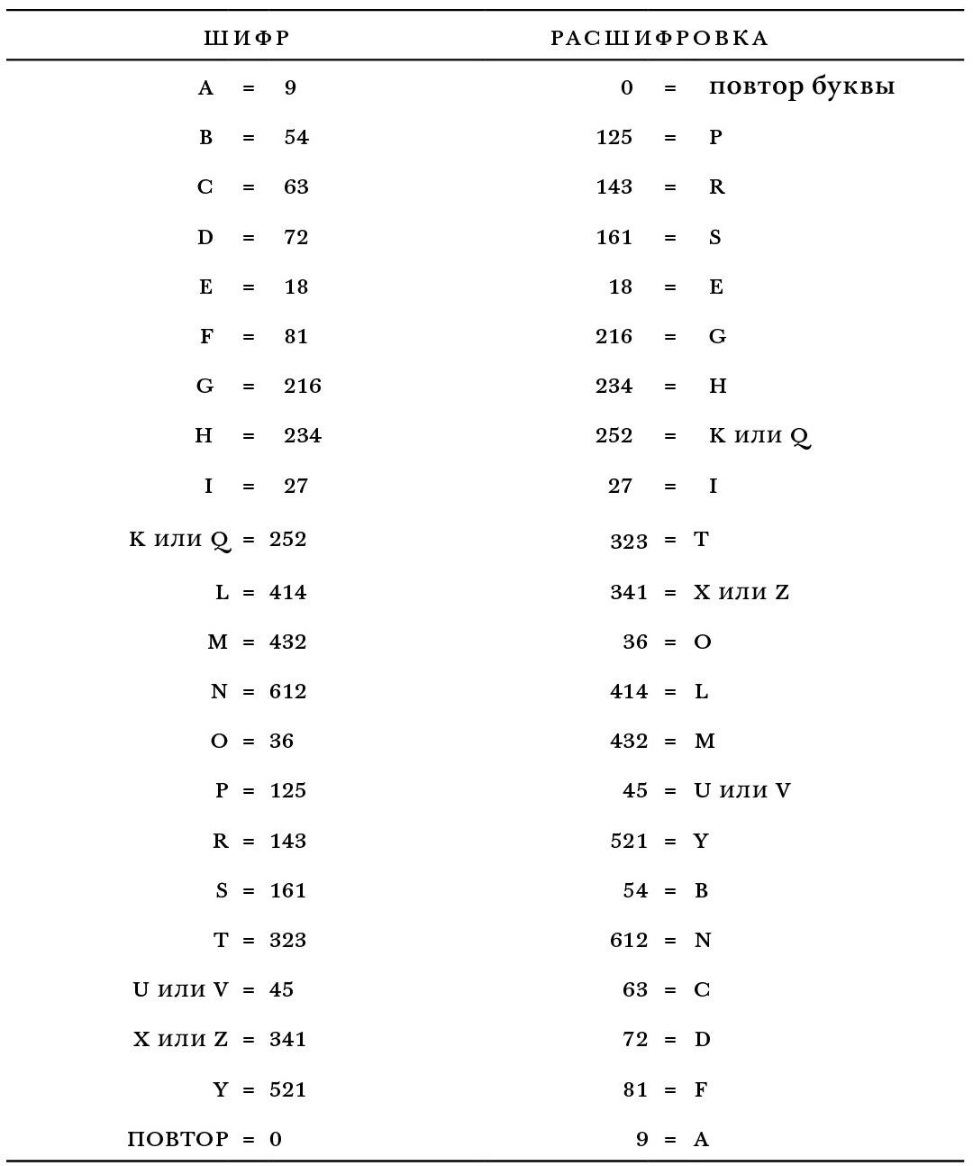 Я закончил шифр на вышеприведенной основе и приступил к расшифровке с ликованием в душе — я чувствовал, что, стоит исправить нестыковки между моей системой и системой автора из прошлого, останется только расшифровать текст.