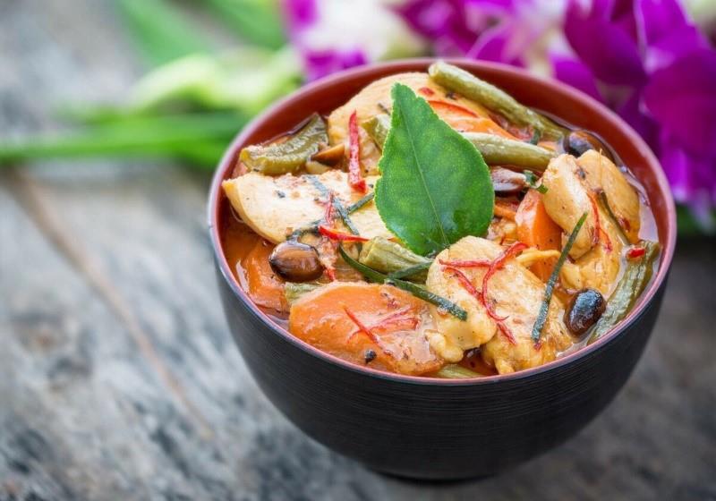 ? Пананг Гай (Panang Gai) – курица в красной пасте карри с кокосовыми сливками (ну и куда же без рыбного соуса). Также добавляют каффир лайм и базилик для невероятного аромата и освежающего вкуса. Паста карри бывает разной остроты, и для Пананг Гай достаточно умеренной степени, так как в блюде присутствует также чеснок.