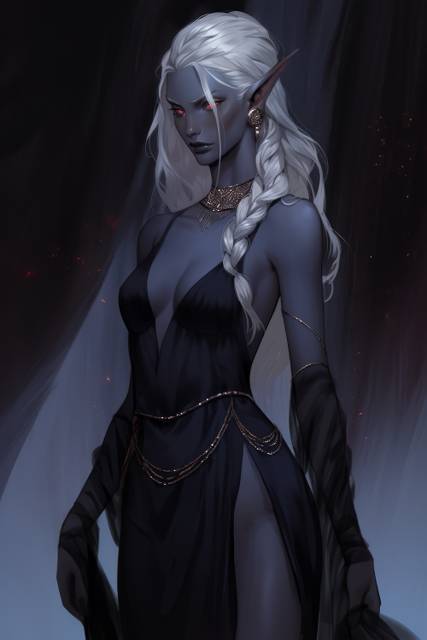 На широких каменных ступенях всех новоприбывших приветствует молодая дроккальфар в роскошном платье цвета ночного неба. На фоне её тёмной с фиолетовым отливом кожи смотрится оно весьма элегантно. Белые волосы свободно спадают до лопаток, лишь тонкая коса — дань местной моде — скользит по плечу.