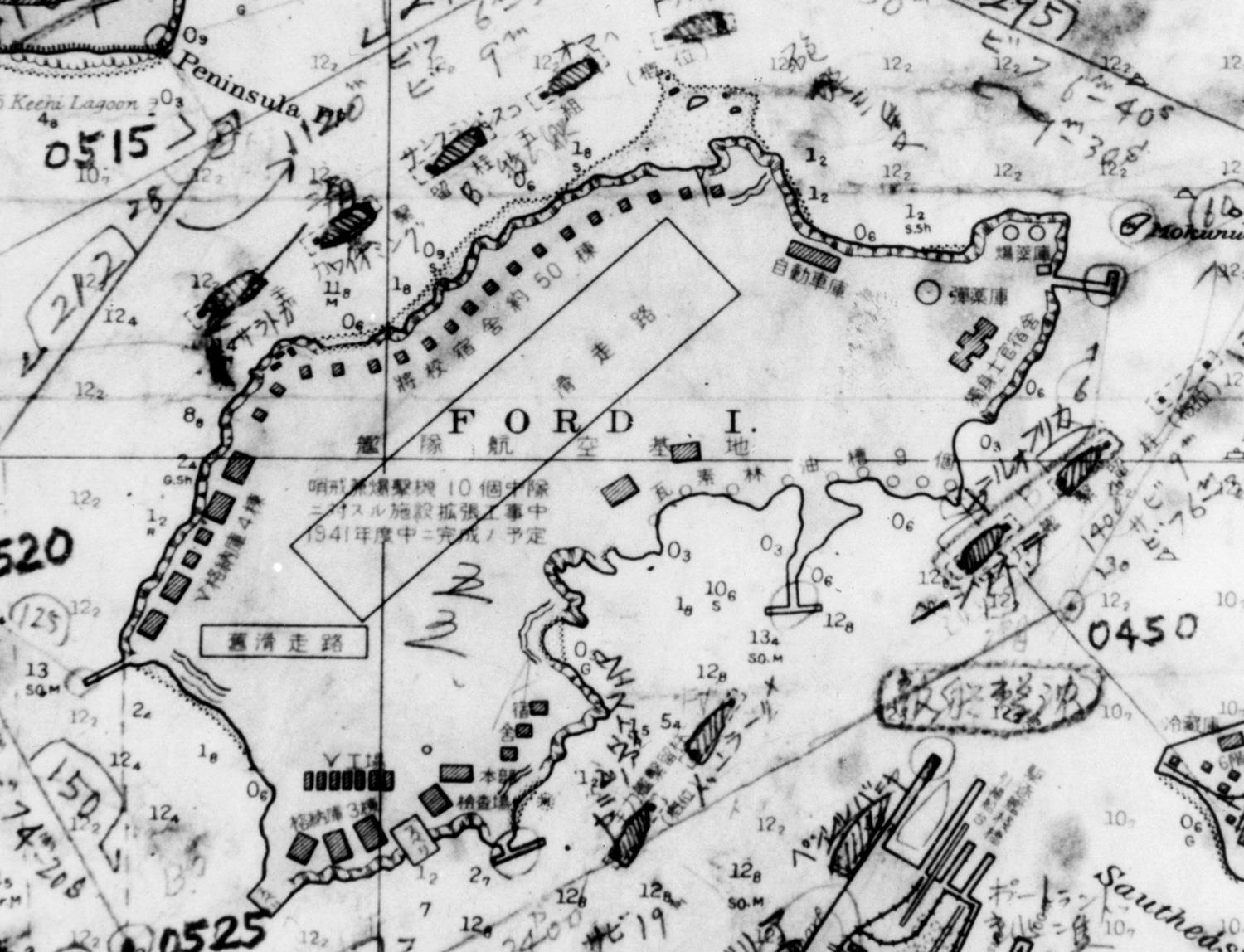 Фрагмент японской навигационной карты гавани Пёрл-Харбор, район острова Форд с указанием глубин.