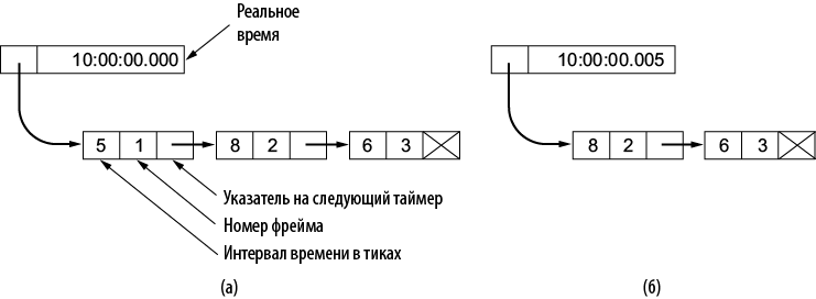 Илл. 3.20. Программная симуляция работы нескольких таймеров. (а) Очередь из нескольких периодов ожидания. (б) Ситуация после истечения первого периода ожидания