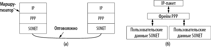 Для связи компьютеров в пределах одного здания широко применяются локальные сети, однако большинство глобальных сетей построено на линиях «точка-точка». С локальными сетями мы познакомимся в главе 4. Здесь рассмотрим три наиболее распространенных случая использования протоколов канального уровня в двухточечных каналах интернета. Первый случай — передача пакетов по оптоволоконным каналам SONET. Такие каналы широко применяются, например, для соединения маршрутизаторов, установленных в разных концах сети провайдера. Вторым примером является использование каналов ADSL в пределах локального абонентского шлейфа телефонной сети. Наконец, мы обсудим применение каналов DOCSIS в пределах локального шлейфа кабельной сети — с их помощью к интернету подключаются миллионы отдельных пользователей и компаний.
