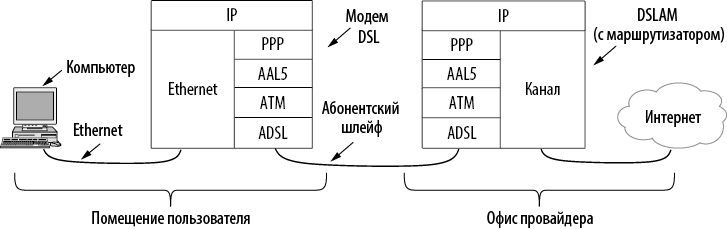 Общая схема работы протоколов и устройств показана на илл. 3.26. В разных сетях применяются различные протоколы, поэтому для демонстрации мы выбрали наиболее популярный сценарий. Домашний компьютер пользователя посылает IP-пакеты DSL-модему, используя канальный уровень, например сеть Ethernet. Затем DSL-модем отправляет IP-пакеты по абонентскому шлейфу на устройство DSLAM с помощью протоколов, которые мы рассмотрим далее. На стороне DSLAM или подключенного к нему маршрутизатора (в зависимости от реализации) IP-пакеты извлекаются, поступают в сеть провайдера и достигают точки назначения в интернете.