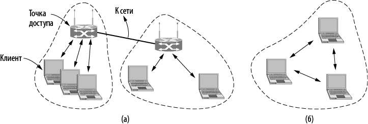 Илл. 4.23. Архитектура сети стандарта 802.11. (а) Инфраструктурный режим. (б) Произвольный режим