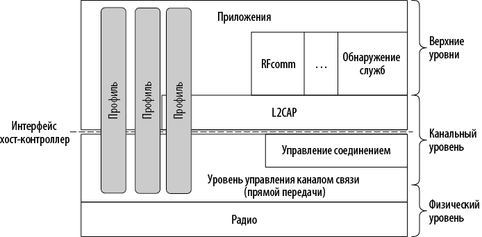 Над линией находится протокол канального уровня — L2CAP (Logical Link Control and Adaptation Protocol — протокол управления логическими связями и сопоставлениями). Он формирует сообщения переменной длины и при необходимости обеспечивает надежность передачи. L2CAP используется множеством протоколов, в том числе и двумя описанными ранее служебными протоколами. Протокол обнаружения служб используется для определения их местонахождения в пределах сети. Протокол RFcomm (Radio Frequency communication — радиочастотная передача) эмулирует работу стандартного последовательного порта ПК, к которому обычно подключаются клавиатура, мышь, модем и другие устройства.