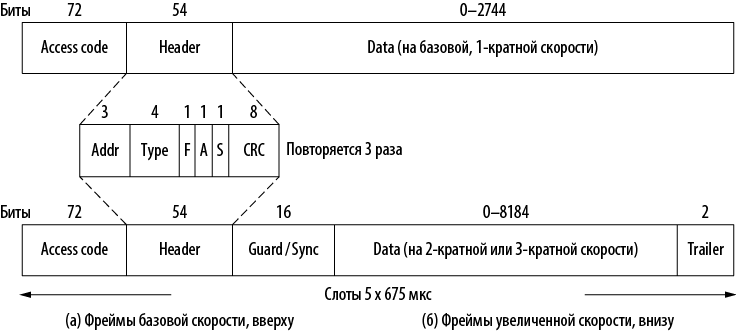 Илл. 4.32. Типичный информационный фрейм Bluetooth. (а) На базовой скорости. (б) На увеличенной скорости