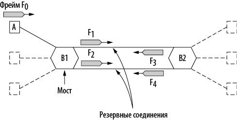 Вскоре после этого мост В2 получает их. Разумеется, он не знает (и не может знать), что это копии, а не два разных фрейма, отправленных друг за другом. Поэтому В2 принимает F1 и F2 и отправляет копии каждого из них со всех остальных портов. Так возникают фреймы F3 и F4, которые по двум соединениям отправляются обратно в В1. Мост В1 видит два новых фрейма с неизвестным адресом назначения и копирует их снова. Этот цикл продолжается бесконечно.